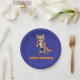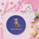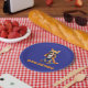 Uma tábua laranja de skate está vestindo fones de ouvido azuis e óculos de sol.