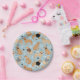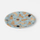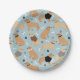 Cães de varejo Ouros bonitos, com casacos escuros e leves, sentam-se e ficam com ossos de cão espalhados e pegadas em um fundo azul.