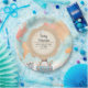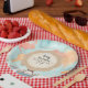A cute co-ed baby shower invitation companion paper plate, with a travel and adventure theme, featuring a scalloped frame with cute characters and travel related elements, with the title Baby Adventure Club. Perfect for future parents who love to travel, who love the adventure theme for a baby shower.