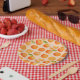 Padrão delicioso e zingado de fruta de citros de laranja em um fundo cor-de-rosa pincelado. Arte original de Nic Squirrell.