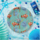 Placas em papel apresentam padrão tropical colorido de peixes inclui peixes palhaços e plantas marinhas submarinas em fundo aqua claro