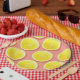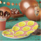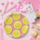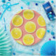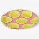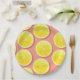 Um padrão de fatias de limão frescas e suculentas em tons claros e vívidos de amarelo, com uma textura aquosa que lhe dá aquele aspecto recém cortado. Eles são colocados sobre um fundo cor-de-rosa de salmão para um visual brilhante e de verão, como uma limonada rosa.