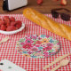 Chá de noiva boêmio moderno com flores silvestres brilhantes com o texto colocado em uma faixa branca. Apresentando tons de rosa brilhante, laranja, vermelho, amarelo, azul e verde, flores botânicas inspiradas em flores silvestres e jardins rústicos modernos em aquarela com verde sutil e tipografia de roteiro minimalista moderna em padrão de fundo bege. Arte original pintada à mão por Caroline Bonne Müller