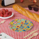 Celebre a alegria de Chanucá com este gráfico de padrão encantado da Rua Sesame! Apresentando personagens amados como Abby Cadabby, Grover, Cookie Monster, Elmo e Big Bird, ao lado de símbolos tradicionais de Chanucá, como sonhos coloridos e menorras brilhantes, esta design captura o espírito festivo do feriado. A combinação alegre de fundo azul, amarelo e laranja torna cada personagem e símbolo pop, adicionando calor e diversão à celebração.