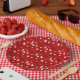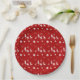 Um padrão de inverno festivo sem descontinuidades em um fundo vermelho. A design inclui silhuetas brancas de renas, árvores de Natal, flocos de neve, corações e crianças brincando com neve. O arranjo repetitivo e simétrico desses elementos cria uma estética alegre e de férias.