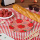 desenho de tomate. Chapas de papel personalizadas. Fundo do padrão de xadrez rosa e vermelha. Ideia para amantes de tomate de todas as idades.