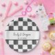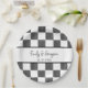 Create personalized paper plates for weddings and other special events. These paper plates have a black and white checkerboard patterned background with painted black squares and alternating plain white squares. Your names and wedding date (or other custom text) appears in black lettering.