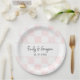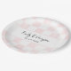 Create personalized paper plates for weddings and other special events. These paper plates have a pink and white checkerboard patterned background with painted pastel pink squares and alternating plain white squares. Your names and wedding date (or other custom text) appears in black lettering.