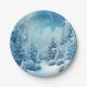 Pratos de papel bonitos com uma imagem de uma floresta de pinheiros coberta de neve. Um dia de Inverno adorável com céu azul e neve caindo.