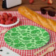 Placas de papel em um padrão de paisley de ornamentado em tons de chartreuse a verde esmeralda profunda em um fundo de verde limão pastel