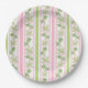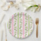 These paper plates have a preppy grandmillennial design featuring a pink Palm Beach style pool chairs and umbrellas surrounded by palm trees.