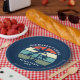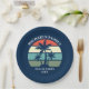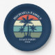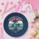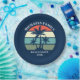 Placa de papel para a festa de praia, para férias de verão ou de primavera, num cruzeiro ilha ou uma viagem à beira-mar tropical. Possui belas palmeiras em frente a um pôr do sol bonito. Personalizar para uma reunião de família ou outra cave costeira.