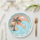Chapas de papel simples, com aspecto de praias, com retrorreflectores coloridos divertidos Ilustração imagem de palmeiras verdes, ondas azuis, sol laranja e raios solares amarelos e rosados. Cercado por palavras relacionadas ao verão... Ondas, festas de praia, boas vibrações, coquetéis, verão, amigos, risos, sol e Surf. Placas legal para uso durante a praia de churrasco de festas de quintal e para ter em estoque no seu pátio ou no bar de Tíki ao lado do polo.