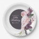 Fontes de festas lindamente únicas para a 50ª festa de aniversário ou qualquer idade, este adorável design de placa de papel inspirado em boho tem um papagaio cor-de-rosa salpicado em cima de flores de aquarela tropicais com uma estrutura redonda roxa de morango escuro. Celebre a dama de aniversário em estilo memorável! Mostrado aqui como 50º aniversário, você pode personalizar a idade para qualquer idade. As belas flores dessa elegante design incluem proteas exóticas, orquídeas, dálias e folhas tropicais.