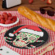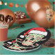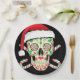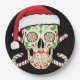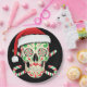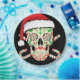 Um crânio temático do açúcar do Natal com papai noel chapéu, olhos do peppermint e crossbones do bastão de doces em um fundo preto.