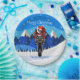Um Papai noel de motociclista corre na neve em sua moto com montanhas ao fundo.