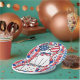 Um gato vestindo óculos escuros de bandeira dos EUA e um arco de gravata com estrelas e listras de papel de fundo. Os guardanapos e copos disponíveis.