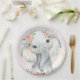 Prato de papel para chá de bebê de elefante menina com elefante bebê fofo com flores em um lindo fundo rosa e dourado. Estes pratos de papel de elefante são facilmente personalizados com texto.