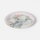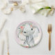 Prato de papel para chá de bebê de elefante menina com elefante bebê fofo com flores em um lindo fundo rosa e dourado. Estes pratos de papel de elefante são facilmente personalizados com texto.
