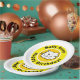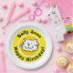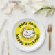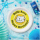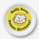 Tema de um gato de desenho animado divertido. Feliz prato de aniversário, decorado com o nome do destinatário, e a mensagem "Parabéns".