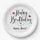 Adicione um toque de charme à sua celebração com estas placas de papel personalizadas com o elegante roteiro de Feliz Aniversário preto e minúsculos sotaques cardíacos. Personalizáveis com um nome, são perfeitos para festas de aniversário, mesas de sobremesa ou eventos temáticos.
