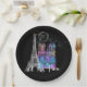 A catedral de Torre Eiffel e Notre Dame, em cores de sherbet do arco-íris, um antigo endereço de Paris e marcos de uma antiga carta francesa a preto, fazem pratos de papel excelente e francês, perfeitos para sua festa ou evento, ou um presente de excelente para um frenófilo.