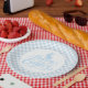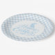 Prato de papel para festa é mostrado em uma linda estampa Páscoa xadrez azul e branco.