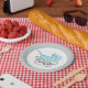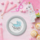 Placa de chá de fraldas doce, feita em uma cinza leve com borda de bolinhas branca e branca sólida no dentro da placa. Gráficos de um carrinho azul-turquesa, velho e parecido com um bebê, decoram o meio branco da placa. Personalize se quiser adicionar texto a esta bela placa de papel do chá de fraldas. Os convites correspondentes e guardanapos de papel estão disponíveis.