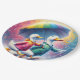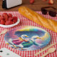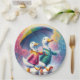 Dois patos brancos vestindo capas de chuva coloridas e botas correspondentes caminham sob um guarda-chuva em um ambiente de chuva vibrante