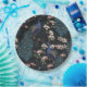 Estes Pavões Elegantes e Flores Magnéticas As chapas de papel preto apresentam pavões azuis desenhados à mão e lacrimejados em ramos de árvores Magnolia, florescendo em tinta preta. Fundo quase negro.