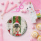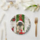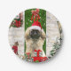 O Natal do Cachorro Pekingês sentado do lado de fora da casa decorada com coroa de Natal, a árvore de Natal é uma ideia perfeita de presente de Natal para amantes de cães.