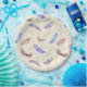 Um padrão composto por penas de aquarelas com faixas variáveis, manchas e designs simples com cores azuis, cor-de-rosa, laranja e castanho. Ramos e galhos com folhas e budas de maricas também decoram o design. O fundo é uma cor sólida de creme.