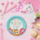 pequenas placas de primeira festa de aniversário monstro com monstros fofos e fundo de cromo azul.