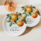 Esta placa de papel com o tema dos citros apresenta gráficos cor d'água laranja e uma fonte moderna. É perfeito para um chá de fraldas temático "Little Cutie" e você pode combiná-lo com qualquer coisa na coleção BRINLEY para um olhar coeso.