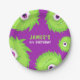 Um bonitinho monstro, festa de aniversário pratos de papel. Verde limão roxo e brilhante. Adicione facilmente uma mensagem personalizada.