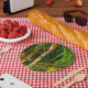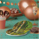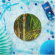 Para uma festa tropical, esta Plata de Papel apresenta uma fotografia original de ZoeSPEAK de palmas de Areca, nativas das florestas das ilhas tropicais do Sudeste Asiático. As finas folhas verdes amarelas fazem padrões interessantes, com seus troncos pálidos no meio, criando um humor tropical.
