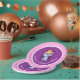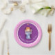 Desenho de anjo de Natal fofo em pratos de papel cor-de-rosa e branco com bolinhas e enfeites roxos personalizados. Personalize com o nome da sua festa ou detalhes do evento. Ideal para festas de Natal de meninas ou eventos temáticos de anjos. Arte e design original em aquarela por Sarah Trett.