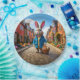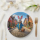 Peter na sua jaqueta azul segurando uma cesta de ovo de Páscoa. Peter está parado numa rua inglesa
