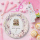 Estes pratos de papel floral doce são para um evento de chá de noiva, com o tema 'Novo capítulo'. O prato apresenta ilustrações de uma pilha de livros decorados com flores em aquarela e o fundo é de flores silvestres da primavera em cores suaves. Fonte de estilo de texto inglês antigo clássico para dar uma sensação de livros de ilustração infantil antigos. Ótimo para uma noiva que ama livros.