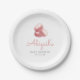 These cute baby shower paper plates feature a watercolor image of a stack of three pink French macaron cookies. Add the name of the mother-to-be in whimsical pink handwriting script, along with the date in charcoal gray sans serif font. Ideal for a girl's baby shower.