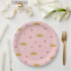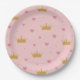 This paper plate features a soft pastel pink background decorated with a whimsical pattern of gold glitter-style crowns and rosy pink hearts. The crowns vary slightly in size and are evenly spaced throughout the design, while the hearts and tiny pink dots add a playful, delicate accent. The overall pattern is seamless, balanced, and feminine—perfect for princess-themed celebrations, baby showers, or first birthday parties.
