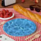 Crie seus próprios pratos de papel fotográfico para um casamento em um resort hotel ao ar livre à beira da piscina.