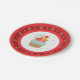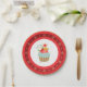 Esta placa de papel apresenta um cupcake de feriado com decoração por estrelas no topo. A borda ao redor da placa é vermelha com flocos de neve dourados e um ouro fora da borda.
