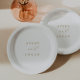 Estes elegantes pratos de bolo de casamento com guião de ouro são perfeitos para um casamento simples. O ouro minimalista e o design branco apresentam tipografia romântica rico com estilo de vidro moderno. Personalizável em qualquer cor. Mantenha o design mínimo e a classe, como está, ou personalize-o adicionando seus próprios gráficos e trabalhos de arte. Estas placas de papel descartáveis são perfeitas para o bolo ou a mesa de sobremesa. Personalize-os com os nomes da noiva e do noivo.