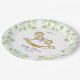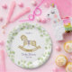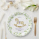 Placa de papel para chá de fraldas, decorada com belas ilustrações aquáticas de um adorável cavalo de balanço, rodeado por galhos delicados com folhas verdes claras.