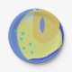 Esta placa de papel apresenta um design gráfico divertido, composto por manchas, linhas e formas circulares desenhadas à mão expressivas em laranja, amarelo, branco e turquesa, sobre fundo azul.