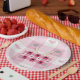 Como homenagem às saborosas guloseimas do verão, este clássico padrão de toalha de piquenique é adornada com uma fatia de melancia cercada por formigas e sementes nos quadrados brancos e uma grelha de chaleira moldada por bifes, cogumelos e peças de carvão na outra. Uma silhueta de piquenique cria uma máscara fofa para o padrão.