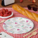 O design é um padrão uniforme com cabeças de unicórnio estilizadas com mansos fluentes e de cor pastel em tons de rosa, amarelo e azul, adornados com faíscas. Os unicórnios têm rostos brancos e chifres ouros, somando sua aparência mágica. Por aí espalhados estão grandes corações cor-de-rosa, assim como flores cor-de-rosa e amarelas com folhas verdes. Todos os elementos são colocados sobre um fundo branco, criando um olhar caprichoso e sonhador.