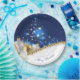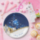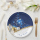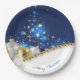 Esta Placa de Papel Branco Azul Clássico apresenta ornamentos em ouro e branco de Natal com cordas de ouro e uma árvore de Natal estilizada. Personalize com suas próprias palavras.