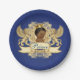Placas africanas reais com o príncipe africano adorável que veste-se, uma coroa do chá de fraldas do príncipe Elegante do ouro na crista de um leão dourado elegante com um fundo dos azuis marinhos.